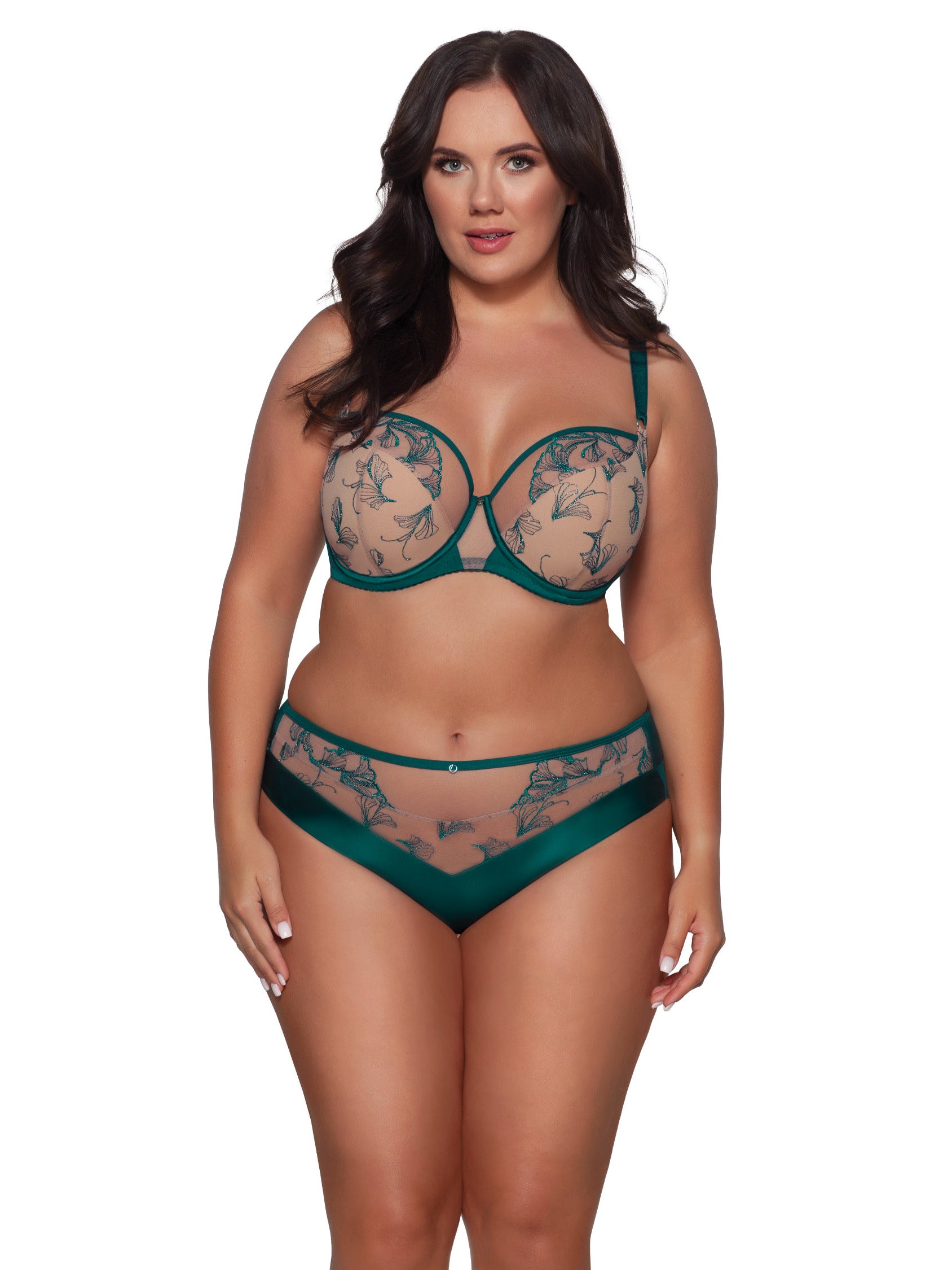 Podprsenka v sýtozelenej farbe s trblietavým nádychom. Čiastočne vystužené košíčky s podopretím z mäkkej béžovej peny zdvíhajú a zhromažďujú prsia, zatiaľ čo elastický pás a priehľadný tylový mostík poskytujú stabilitu. Jemný tyl vyšívaný lesklou niťou v prepracovanom kvetinovom vzore zvýrazňuje poprsie.