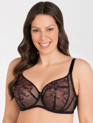 Mäkká podprsenka s kosticami. Vyrobená z dvojitej priehľadnej sieťoviny s farebnou výšivkou. Nastaviteľné, neodnímateľné ramienka. Pás je zo sieťoviny so zvislou kosticou.