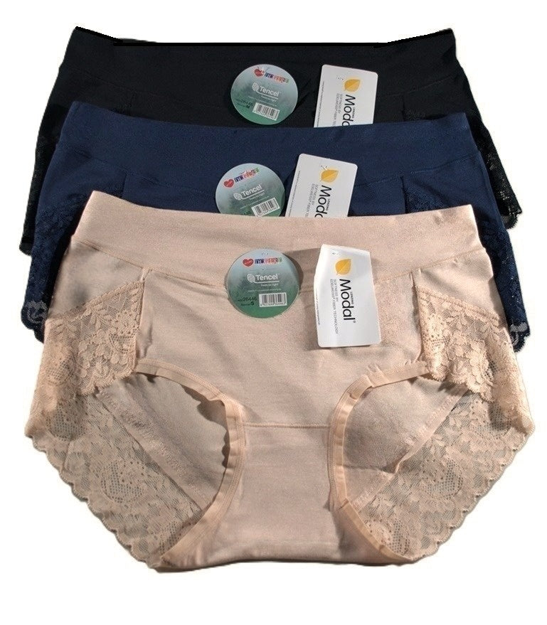 Hladké dámske nohavičky s vysokým pásom z jemného modalu s čipkou. Balené po 12 kusoch v mixe veľkostí (S, M, L, XL) a farieb.