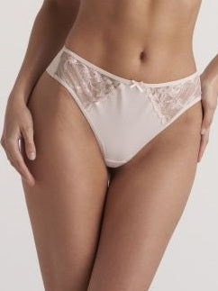Dámske brazílske nohavičky. Vyrobené z jemného, ​​elastického materiálu. Bezšvový zadný diel zaisťuje bezproblémové nosenie pod oblečením. Boky zdobí ozdobná čipka a prednú časť malá mašľa.