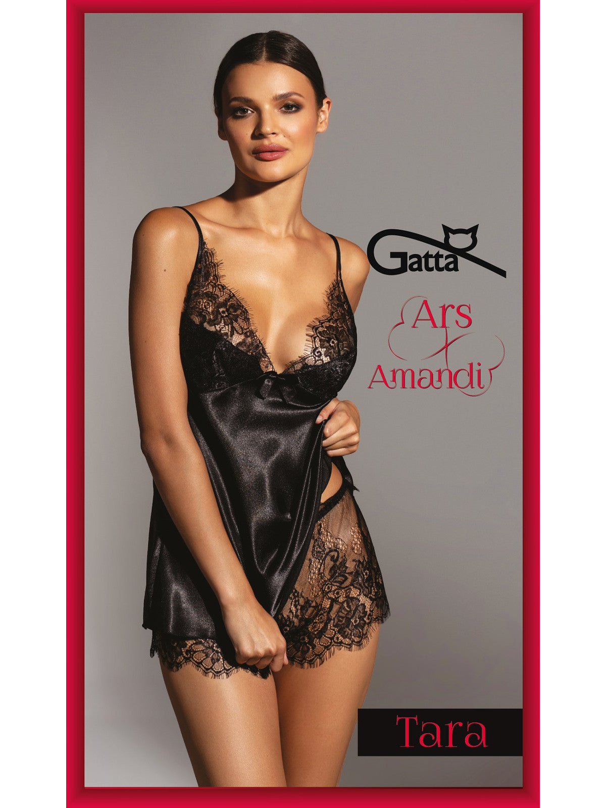 Sexy dámske pyžamo, košieľka s tenkými, nastaviteľnými ramienkami a výstrihom lemovaným čipkou. Čipkované šortky.