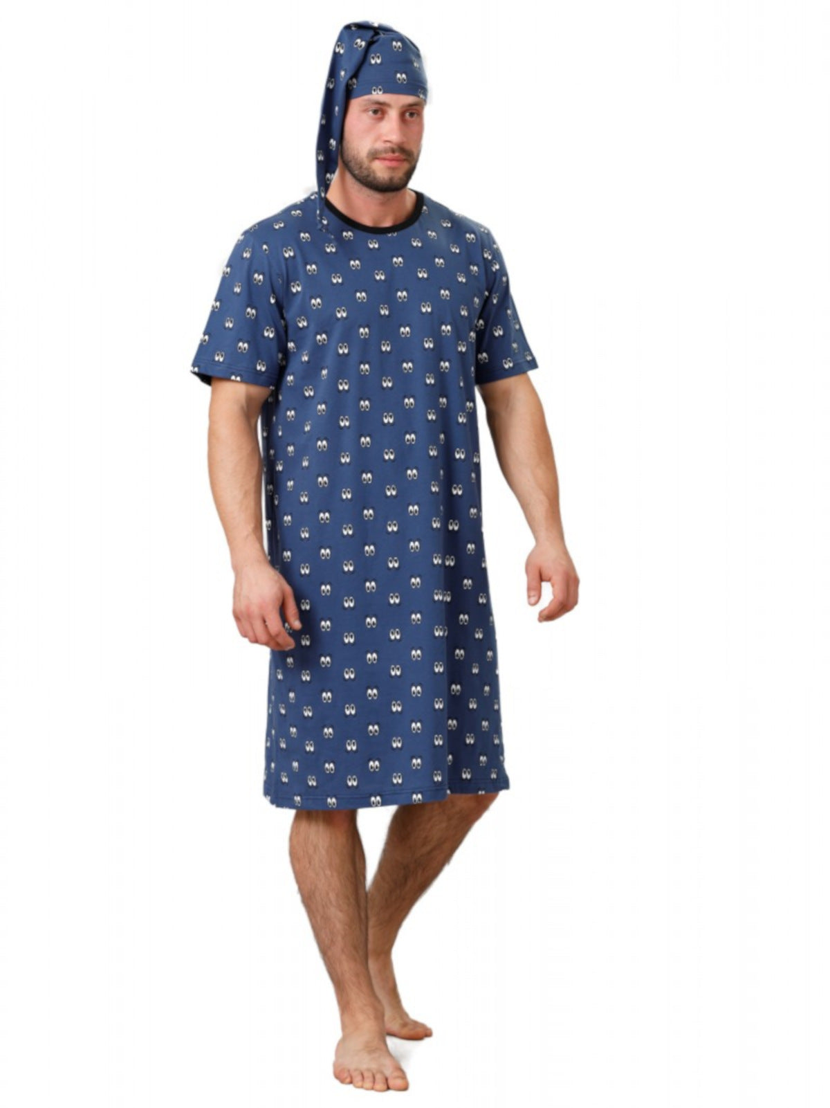 Pánska nočná košeľa s krátkym rukávom, vyrobená z vysoko kvalitnej vzorovanej bavlny. Súčasťou je nočná čiapka.