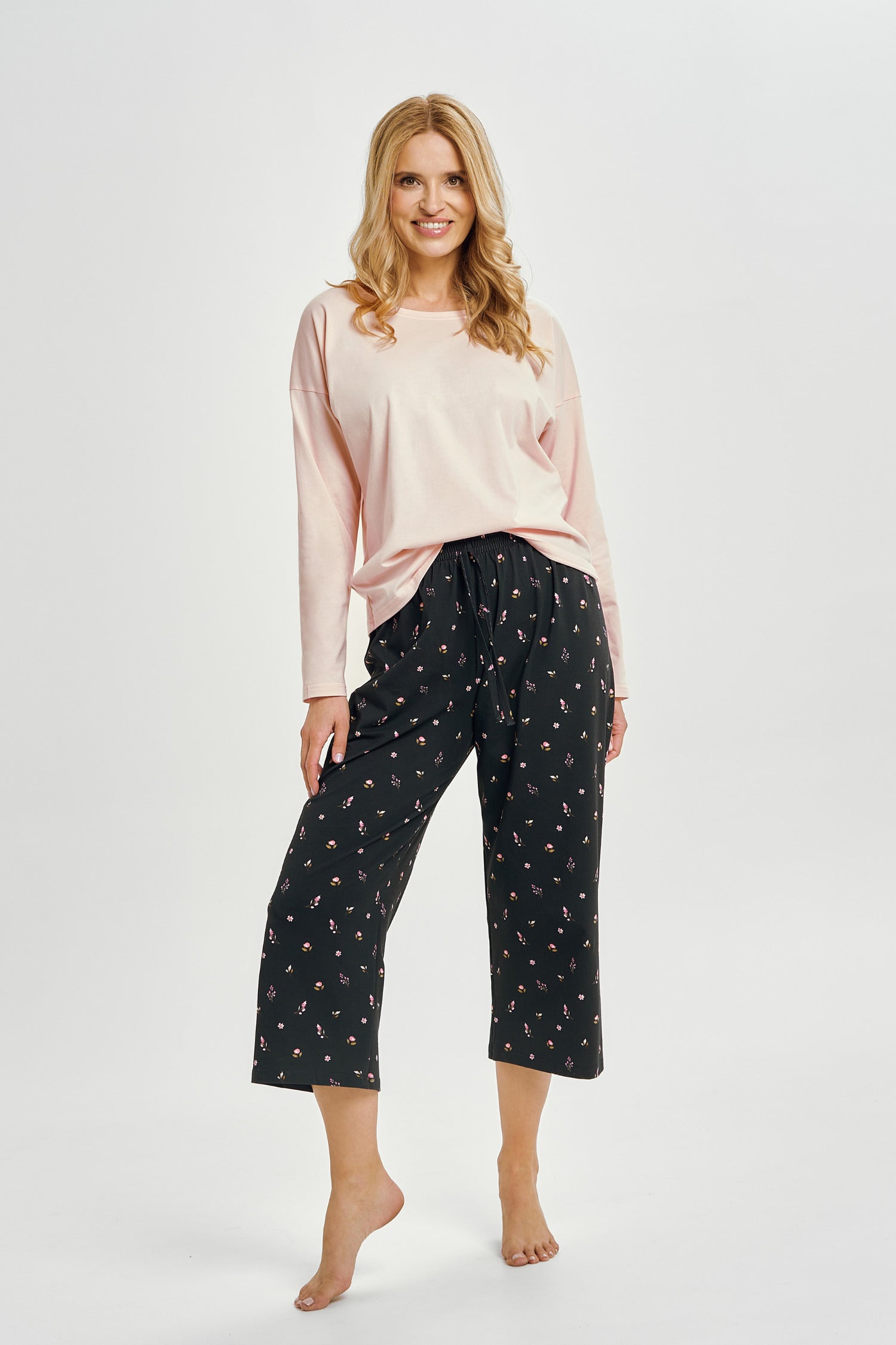 Dlhé dámske pyžamo vyrobené z mäkkej 100 % bavlny. Tričko s dlhým rukávom poskytuje teplo v chladnejších dňoch. Nohavice dĺžky 7/8 s jemným kvetinovým vzorom dodávajú ženský nádych. Ozdobný sťahovací pás so šnúrkou zabezpečuje pohodlnú a klasickú každodennú voľbu.