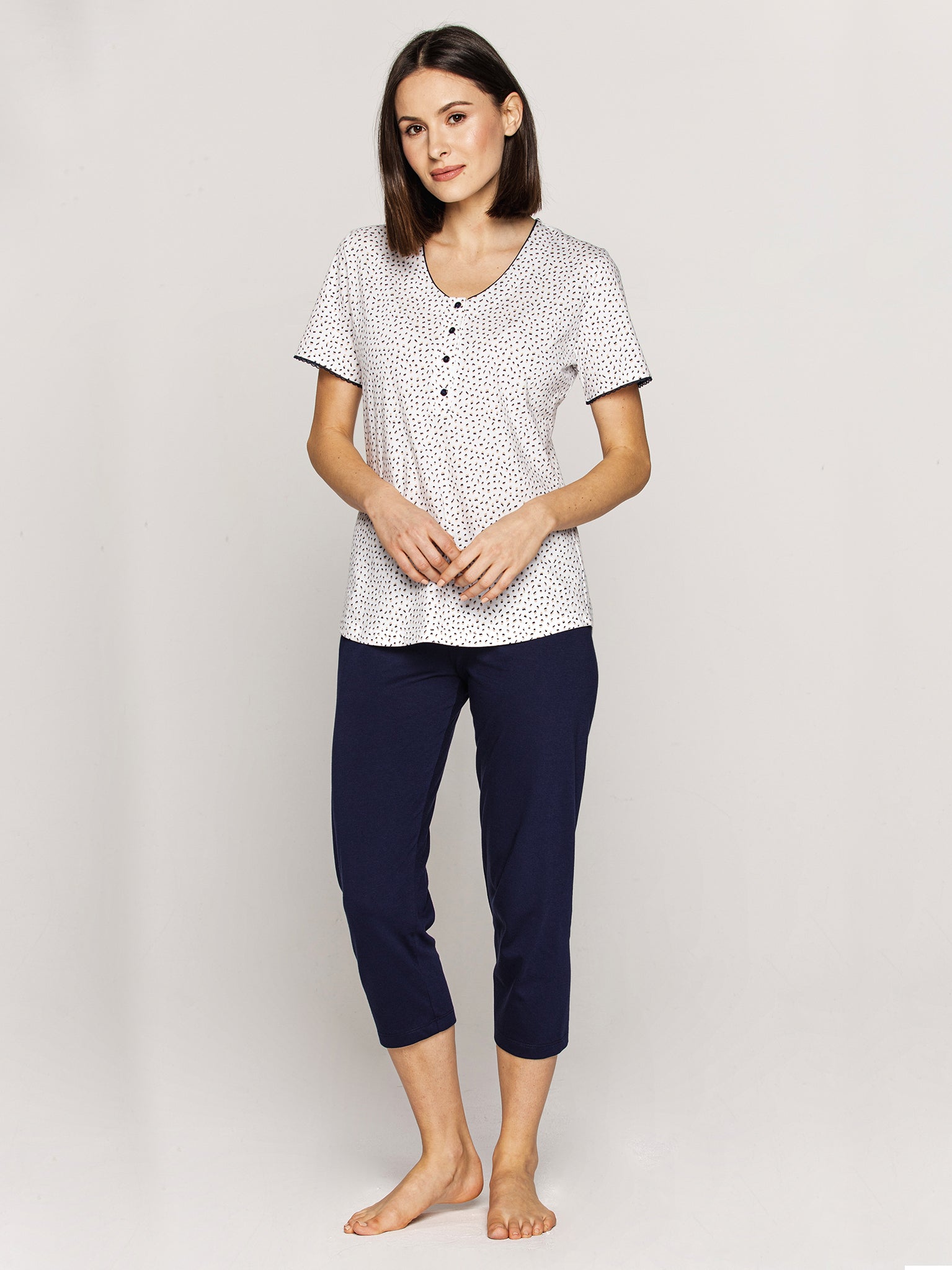 Pohodlné dámske pyžamo vyrobené z vysoko kvalitnej bavlny. Tričko s krátkym rukávom má okrúhly výstrih a zapínanie na gombíky. Tričko dopĺňajú 3/4 šortky v kontrastnej farbe.