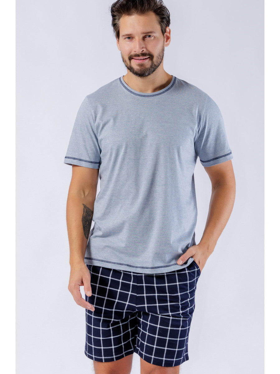 Pyžamo GRZEGORZ 1592 je perfektnou voľbou pre mužov, ktorí hľadajú pohodlie v kombinácii s módnym dizajnom. Rebrovaný vrch zo 100 % bavlnenej melanže zaisťuje nielen pohodlie, ale aj správnu cirkuláciu vzduchu. Dostupné v dvoch klasických farbách – sivej a tmavomodrej. Tričko s krátkym rukávom, okrúhlym výstrihom a kontrastným prešívaním sa perfektne hodí k tmavomodrým kockovaným šortkám, ktoré majú praktické vrecká pre voľný pohyb. Voľný strih zaisťuje úplné pohodlie, vďaka čomu je vynikajúcou voľbou pre dobrý nočný spánok a relax.