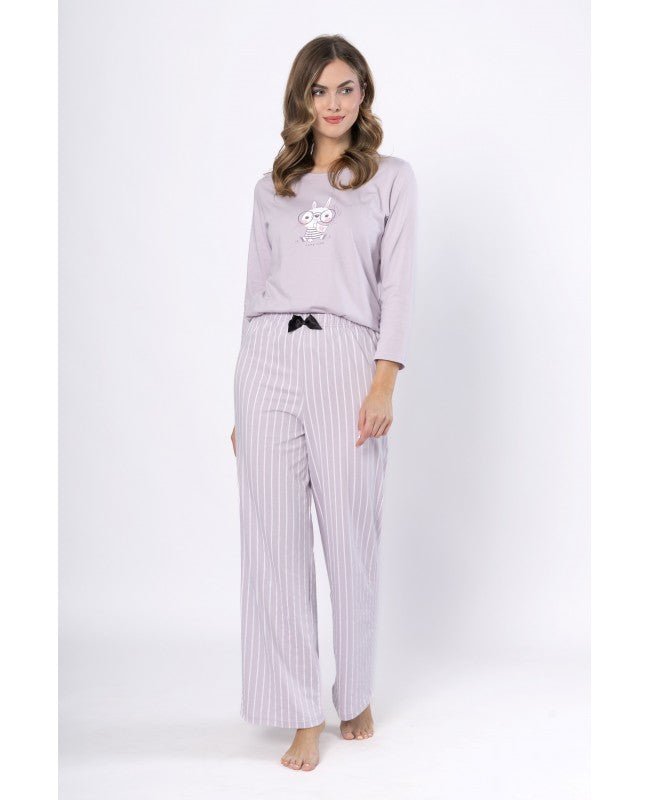 Súprava zo 100 % bavlny. Blúzka s potlačou fialového zajačika a 7/8 rukávmi. Nohavice s vertikálnymi pruhmi, dlhými nohavicami a ozdobnou mašľou.
