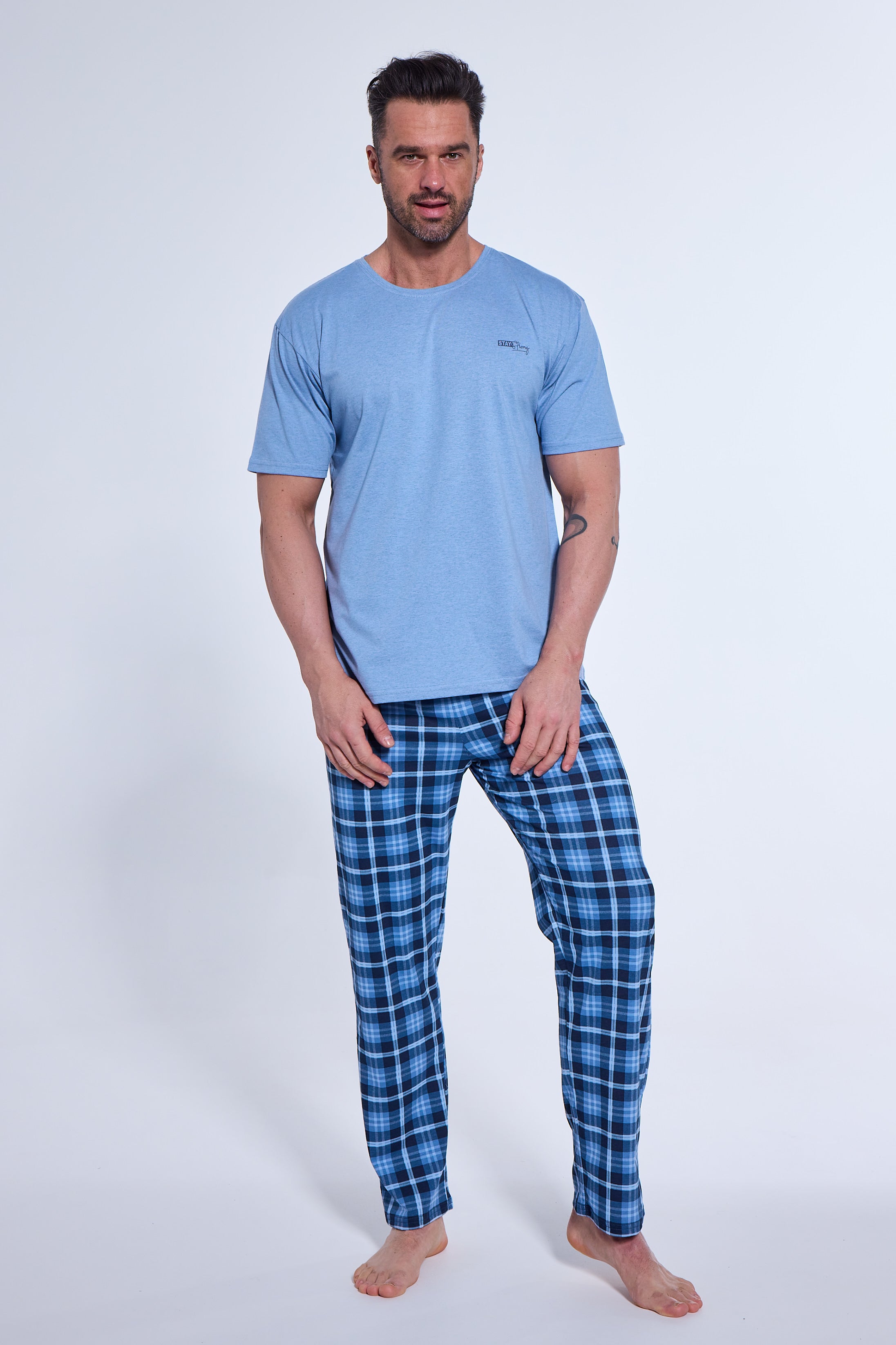 Všestranné pánske pyžamo vyrobené z vysoko kvalitnej bavlny. Jednoduché tričko s krátkym rukávom má decentnú aplikáciu na hrudi. Dlhé, rovné nohavice s klasickým kockovaným vzorom zaisťujú pohodlie a slobodu pohybu.
