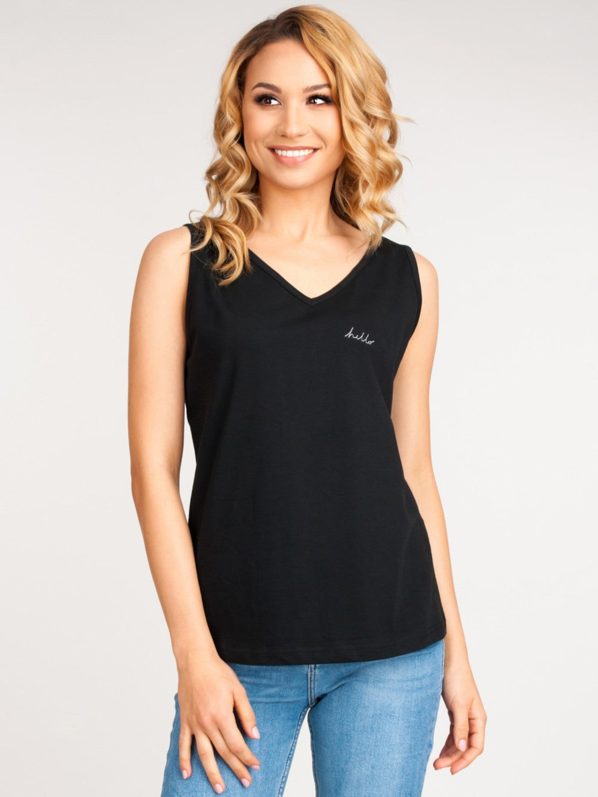 Dámske tričko so širokými ramienkami a malým nápisom na boku. Výstrih do V.