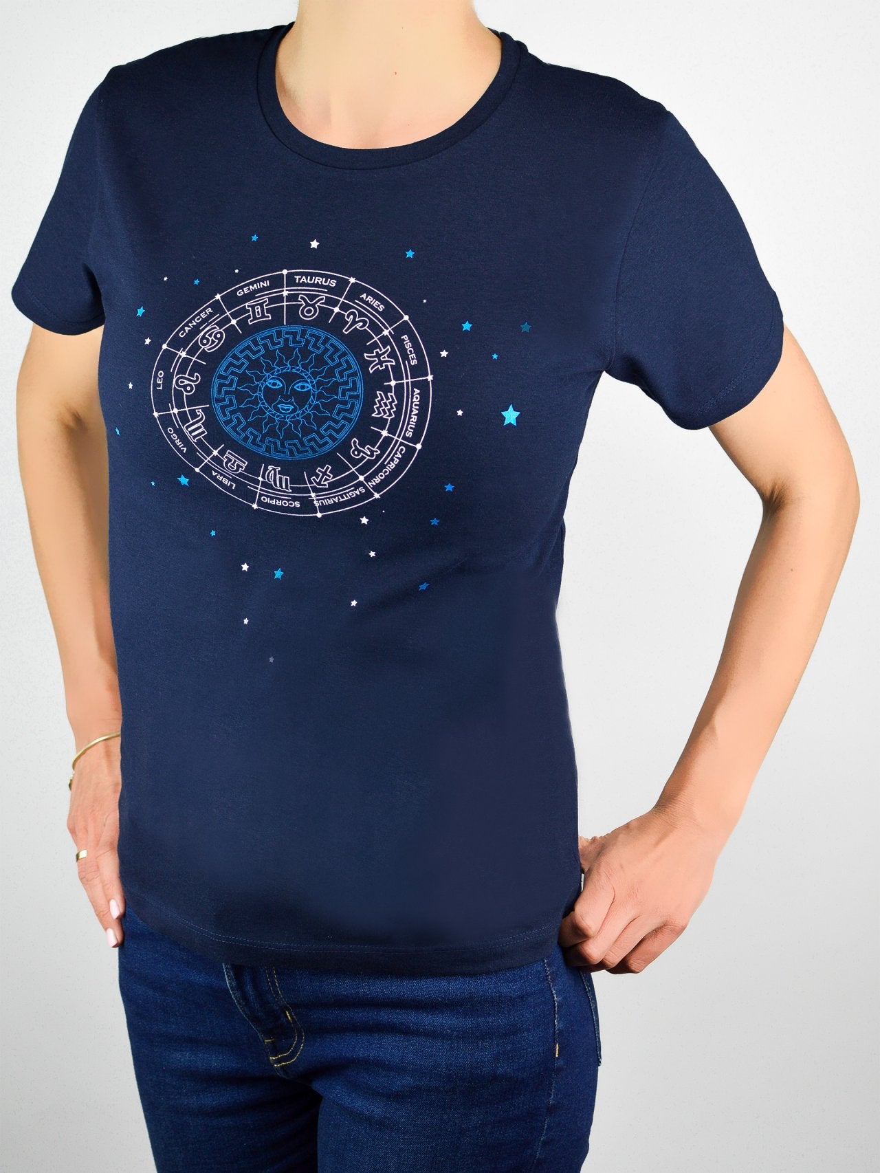 Dámske tričko s krátkym rukávom vyrobené z vysoko kvalitnej, mäkkej bavlny. Má štýlovú potlač zverokruhu na prednej strane, okrúhly výstrih a klasický strih.