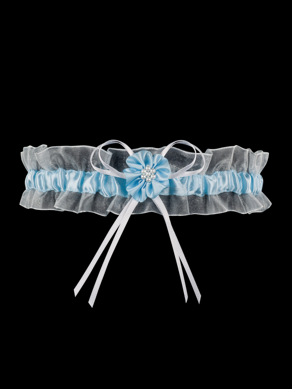 Modrobiely, typicky svadobný podväzok vyrobený zo saténovej stuhy, lemovaný jemným tylom na vrchu a spodku, ozdobený bielou mašľou a modrým kvietkom s drobnými perličkami v strede. Model Helsinki je určený pre tradicionalistky, ktoré dbajú na najmenšie detaily.
