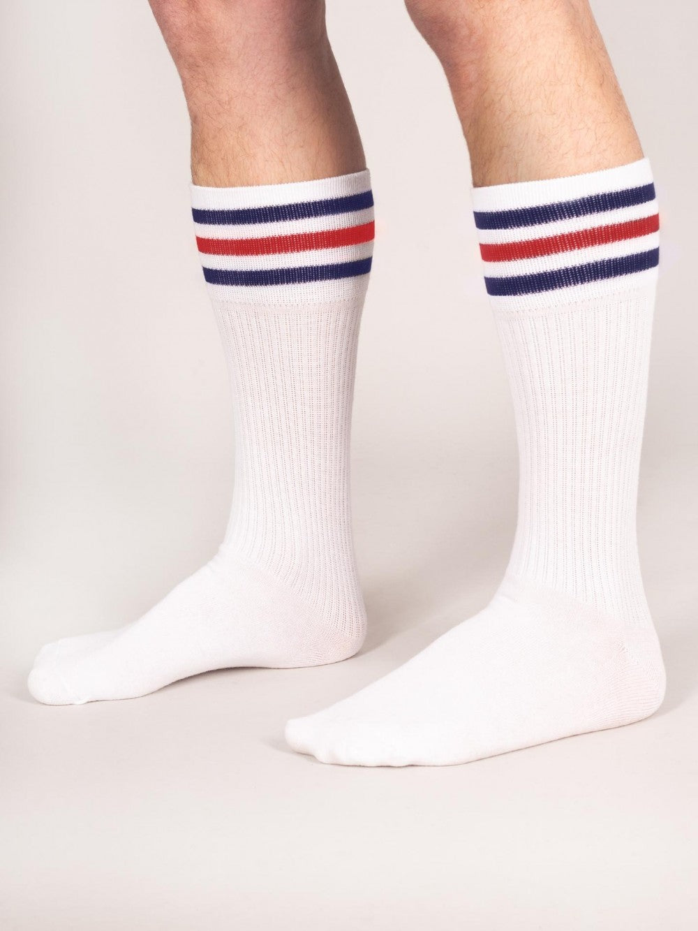 Biele športové ponožky s tromi pruhmi na manžete. Tento model s dĺžkou do polovice lýtok poskytuje vynikajúcu ochranu pred odermi počas športu. Ponožky sú mäkké na dotyk a priliehajú. Vďaka elastickej manžete sa nekotúľajú ani nekrútia. Veľmi pohodlné, zaisťujú vynikajúce pohodlie, ideálne na nosenie so športovou obuvou.