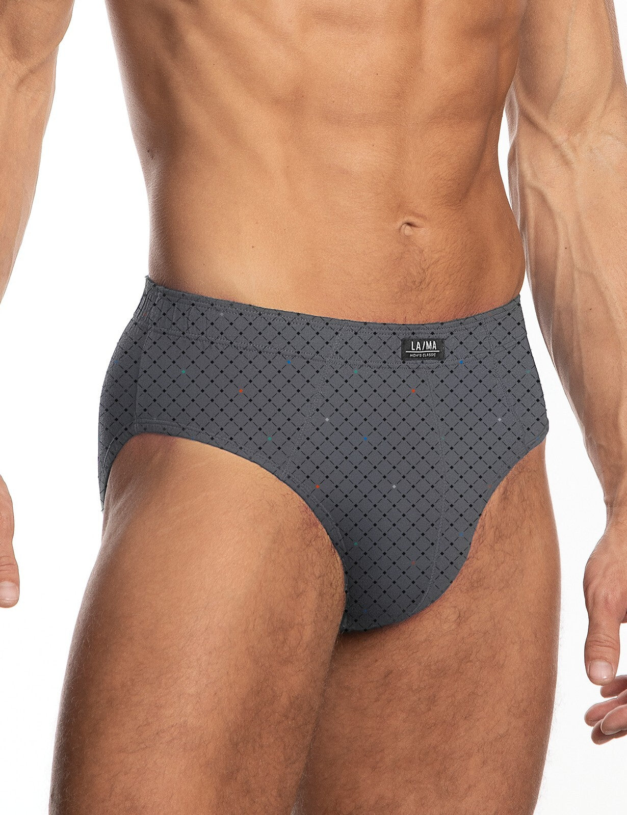 Klasické pánske slipy z vysoko kvalitnej bavlny, zdobené geometrickým vzorom. Majú pohodlný elastický pás s bavlneným lemom a nášivku s logom LAMA. Sada je balená v elegantnej krabičke a obsahuje tri farby: sivú, zelenú a tmavomodrú.