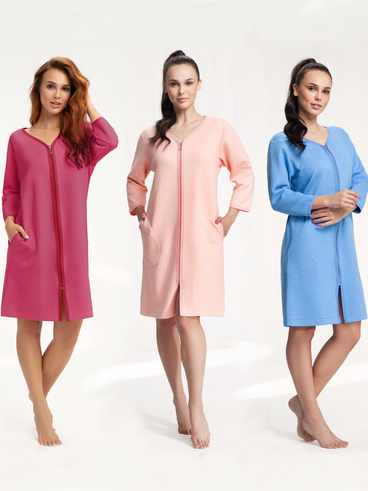 Tento elegantný dámsky župan na zips je v krásnej jarnej pastelovej farbe. Je lemovaný lemovaním a má praktické vrecká.
